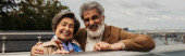 Widok z boku młodej wieloetnicznej pary uśmiechającej się do siebie nad morzem, sztandar