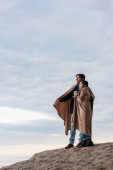 mężczyzna przytulanie Azji dziewczyna z koc i puchar na wzgórzu, sztandar