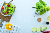 Płyta ze zdrową sałatką z serem feta i oliwkami na drewnianym tle