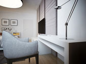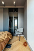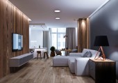 Kreatywna kompozycja detali nowoczesnego salonu wnętrza w małym apartamencie. Czarny commode, zaprojektowany drewniany stolik kawowy, telewizor i akcesoria osobiste. Drewniane ściany i dywan na parkiecie. Panaramiczne okno. Wzór.