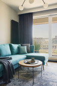 Zdjęcie "Kreatywna kompozycja detali nowoczesnego salonu wnętrza w małym apartamencie. Czarny commode, zaprojektowany drewniany stolik kawowy, telewizor i akcesoria osobiste. Drewniane ściany i dywan na parkiecie. Panaramiczne okno. Wzór." może być wykorzystywane do celów osobistych i komercyjnych zgodnie z warunkami zakupionej licencji Royalty-free. Obraz jest dostępny do pobrania w jakości wysokiej rozdzielczości do 5760x3840.