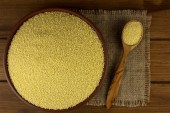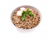 Gotowana gryka w talerzu z liściem pietruszki i masłem na białym.