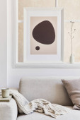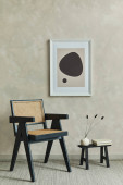 Zdjęcie "Stylowa minimalistyczna kompozycja przytulnego salonu z makietą ramą plakatu, szezlongiem, białą lampą, drewnianą kostką i eleganckimi akcesoriami osobistymi. Neutralny beżowy mur. Wzór." może być wykorzystywane do celów osobistych i komercyjnych zgodnie z warunkami zakupionej licencji Royalty-free. Obraz jest dostępny do pobrania w jakości wysokiej rozdzielczości do 5760x3840.
