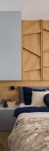 Zdjęcie "Szary szafka nocna obok stylowe i przytulne łóżko w jasnej sypialni z drewnianymi dekoracjami na ścianie" może być wykorzystywane do celów osobistych i komercyjnych zgodnie z warunkami zakupionej licencji Royalty-free. Obraz jest dostępny do pobrania w jakości wysokiej rozdzielczości do 5760x3840.