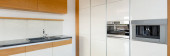 Nowoczesna kuchnia z białymi meblami, drewniana ściana i stylowa niebieska ściana