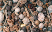 jesienne szczegóły. kasztany w łupinach, szyszki sosnowe, czerwone owoce, jabłko