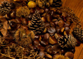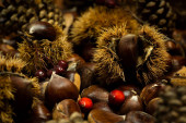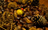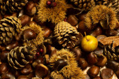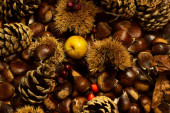 jesienne szczegóły. kasztany w łupinach, szyszki sosnowe, czerwone owoce, jabłko
