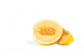 Melon na białym tle. Żółty melon na białym izolacie. Świeży soczysty kawałek melona z cieniem na białym tle. Do umieszczenia w projekcie, projekcie lub reklamie