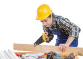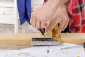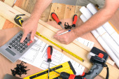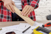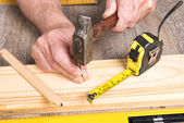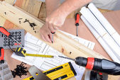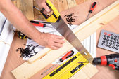 człowiek zrobił mebel z różnych narzędzi stolarskich