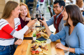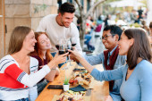 Grupa podekscytowanych młodych przyjaciół dzielących toast, gdy piją kieliszki czerwonego wina, delektując się posiłkiem w pubie lub restauracji świętując specjalną okazję