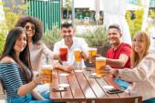 Zdjęcie "Grupa podekscytowanych młodych przyjaciół dzielących toast, gdy piją kieliszki czerwonego wina, delektując się posiłkiem w pubie lub restauracji świętując specjalną okazję" może być wykorzystywane do celów osobistych i komercyjnych zgodnie z warunkami zakupionej licencji Royalty-free. Obraz jest dostępny do pobrania w jakości wysokiej rozdzielczości do 5760x3840.
