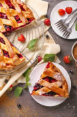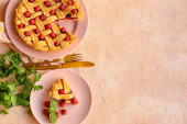 Talerz z kawałkiem smacznego placka wiśniowego na jasnym drewnianym tle