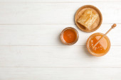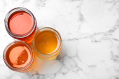 Dzbanki r?? nych dżemy na bia? ym drewnianym stole, p? askie uk? ady. Miejsce na tekst