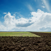czarny roślin uprawnych pól po zbiorze i niebieski niebo