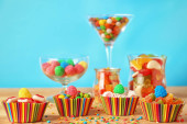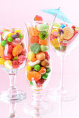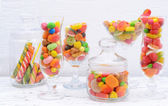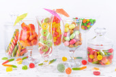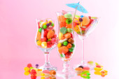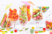 różnych kolorowych owocowych cukierków w okularach na stole na jasnym tle