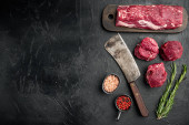 Zdjęcie "Beef cut surowy zestaw ze starym nożem rzeźnika tasak, na czarnym drewnianym tle tabeli, widok z góry płaski leżak, z miejsca na tekst" może być wykorzystywane do celów osobistych i komercyjnych zgodnie z warunkami zakupionej licencji Royalty-free. Obraz jest dostępny do pobrania w jakości wysokiej rozdzielczości do 5760x3840.