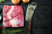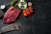 Beef cut surowy zestaw ze starym nożem rzeźnika tasak, na czarnym drewnianym tle tabeli, widok z góry płaski leżak, z miejsca na tekst