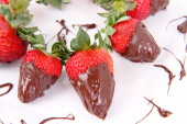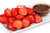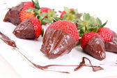 truskawki zanurzone w fondue czekoladowe na białym tle
