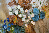 Zdjęcie "Kolorowe kwiaty i zieleni na ścianie zamknąć. Sztuczne kwiaty zdobią wnętrze." może być wykorzystywane do celów osobistych i komercyjnych zgodnie z warunkami zakupionej licencji Royalty-free. Obraz jest dostępny do pobrania w jakości wysokiej rozdzielczości do 5760x3840.