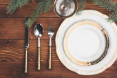 Boże Narodzenie stół ustawienie z gałęzi sosny i dekoracje widok z góry