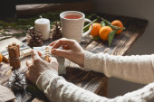 Przytulne jesienne dni. Kobieta w pomarańczowym swetrze herbata zaparzona w czerwonym czajniku na stole z lnianym obrusem. Aromatyczny nastrój. Spadające wibracje. Picie herbaty. Dziękczynienie. Skupienie selektywne.
