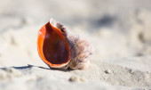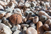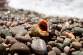 Świecący fioletowy otwarty muszla małż zbliżenie na biały żwirowy kamienny plaża na joński morze w Grecja. Powłoka małży układająca się pod słońcem z rozmytym tłem