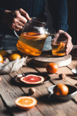 Jesienny płaskowyż. Dłonie kobiety trzymając filiżankę z cytrynową gorącą herbatą i anyżem przy ciemnym drewnianym stole. Dynia i inne kolorowe owoce jesieni, otwarta książka i suszone liście na drewnianym tle widok z góry.