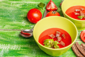 Zdjęcie "Arbuz gazpacho, tradycyjna hiszpańska letnia zimna zupa. Świeże warzywa i zielenina. Zielone drewniane tło, przestrzeń do kopiowania" może być wykorzystywane do celów osobistych i komercyjnych zgodnie z warunkami zakupionej licencji Royalty-free. Obraz jest dostępny do pobrania w jakości wysokiej rozdzielczości do 5760x3840.