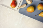 Ceramiczna miska z jagodami na szarym stole, płaska murawa i miejsce na tekst. Przybory kuchenne