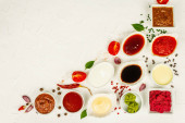 Domowej roboty zupa pomidorowa. Zdrowe wegetariańskie jedzenie, minimalistyczna koncepcja. Różowa papryka, fioletowe kwiaty bazylii. Jasnoczerwone matowe tło, widok z góry