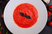Pikantna jesienna zupa pomidorowa. Zdrowe gorące jedzenie, czosnek, chili, bazylia. Czarny kamień beton tło, widok z góry