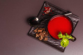 Pikantna jesienna zupa pomidorowa. Zdrowe gorące jedzenie, czosnek, chili, bazylia. Czarny kamień beton tło, widok z góry