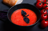 Zdjęcie "Pikantna jesienna zupa pomidorowa. Zdrowe gorące jedzenie, czosnek, chili, bazylia. Czarny kamień betonowe tło, przestrzeń kopiowania" może być wykorzystywane do celów osobistych i komercyjnych zgodnie z warunkami zakupionej licencji Royalty-free. Obraz jest dostępny do pobrania w jakości wysokiej rozdzielczości do 5760x3840.