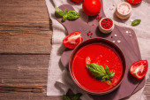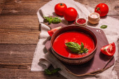 Zdjęcie "Wegańskie jedzenie, pikantne pomidory gazpacho zupa z toastami, dojrzałe warzywa, i świeże zioła bazylii. Czarny kamień betonowe tło, zbliżenie" może być wykorzystywane do celów osobistych i komercyjnych zgodnie z warunkami zakupionej licencji Royalty-free. Obraz jest dostępny do pobrania w jakości wysokiej rozdzielczości do 5760x3840.