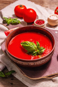 Zdjęcie "Wegańskie jedzenie, pikantne pomidory gazpacho zupa z toastami, dojrzałe warzywa, i świeże zioła bazylii. Czarny kamień betonowe tło, zbliżenie" może być wykorzystywane do celów osobistych i komercyjnych zgodnie z warunkami zakupionej licencji Royalty-free. Obraz jest dostępny do pobrania w jakości wysokiej rozdzielczości do 5760x3840.
