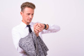Studio zdjęcie biznesmena z blond włosami na szarym tle w czerni i bieli