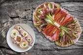 Płyta z bruschettą z rysunkiem wyizolowanym na białym tle