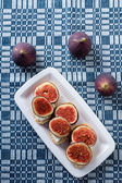 Koncepcja smacznego jedzenia z bruschettą z figami na białym, teksturowanym stole