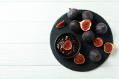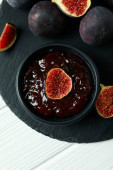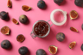 Słoik z dżemem figowym i łyżką oraz składniki na różowym tle