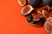 Taca z dżemem figowym i składniki na białym drewnianym tle