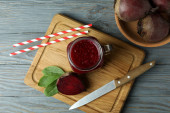 Słoik z dżemem figowym i łyżką oraz składniki na drewnianym tle