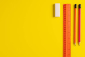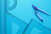 linijka, trójkąt, ołówek, gumka, kłamstwo na niebieskim papierze, akcesoria do rysowania