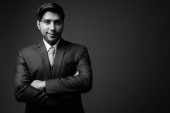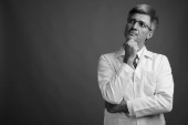 Studio strzał człowieka lekarz z blond włosy na szarym tle w czerni i bieli
