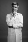 Zdjęcie "Studio strzał człowieka lekarz z blond włosy na szarym tle w czerni i bieli" może być wykorzystywane do celów osobistych i komercyjnych zgodnie z warunkami zakupionej licencji Royalty-free. Obraz jest dostępny do pobrania w jakości wysokiej rozdzielczości do 5760x3840.