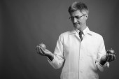 Zdjęcie "Studio strzał człowieka lekarz z blond włosy na szarym tle w czerni i bieli" może być wykorzystywane do celów osobistych i komercyjnych zgodnie z warunkami zakupionej licencji Royalty-free. Obraz jest dostępny do pobrania w jakości wysokiej rozdzielczości do 5760x3840.