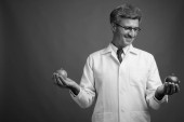 Studio strzał człowieka lekarz z blond włosy na szarym tle w czerni i bieli