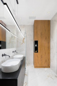 Zdjęcie "Przestronna i nowoczesna łazienka z owalną wanną, umywalką, dużym lustrem, lampą LED, stylowymi niebieskimi i złotymi meblami oraz marmurowymi płytkami podłogowymi i ściennymi" może być wykorzystywane do celów osobistych i komercyjnych zgodnie z warunkami zakupionej licencji Royalty-free. Obraz jest dostępny do pobrania w jakości wysokiej rozdzielczości do 5760x3840.