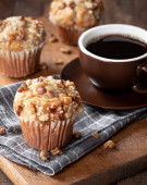Bananowe babeczki orzechowe i filiżanka kawy na serwetce i desce do krojenia