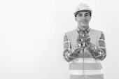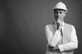 Studio shot człowieka budowlańca na szarym tle w czerni i bieli