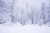 Zimowy krajobraz ze śnieżnymi drzewami i płatkami śniegu. Koncepcja świąteczna